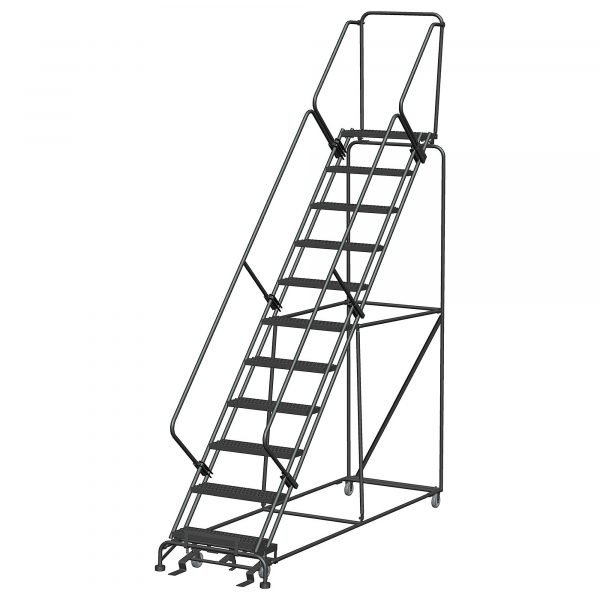 The Ballymore SPL-11-X Safety Lock Rolling Ladder is a specialized 11-step unit, reaching 143 inches, featuring a unique Safety Lock (SPL) mechanism for enhanced locking control. This heavy-duty model is built with rugged steel and includes Serrated (X) treads for a strong grip. The SPL system ensures that the ladder remains positively locked to the floor until the operator releases the mechanism, offering superior control over traditional automatic locking systems. The Ballymore SPL-11-X is ideal for applications requiring guaranteed, deliberate locking before ascending.
