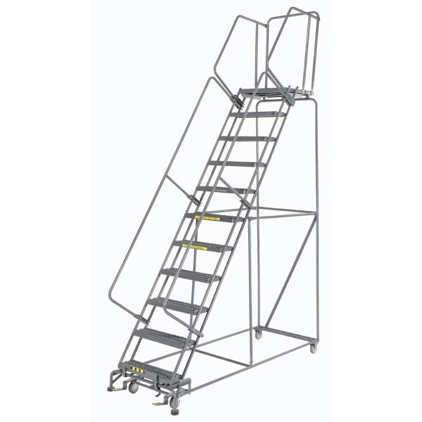 Ballymore 113214X Industrial Rolling Ladder is a heavy-duty 11-step ladder providing reliable access up to 143 inches. This unit is constructed with rugged steel and features Serrated Grating (X) treads for strong, durable grip. Designed for frequent industrial use, the ladder moves easily on rolling casters but locks securely to the floor via its automatic mechanism the moment the operator steps on. The Ballymore 113214X is a dependable solution for high-reach maintenance and inventory tasks.