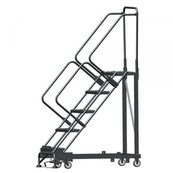 Heavy Duty Stairway Slope Ladder – 600lbs. Capacity. The 50° slope allows easier climbing and descent. The component design allows damaged parts to be replaced which will save money and will extend the life of the ladder. The Base Frame and Rear Vertical are made of rugged 1” x 2” tubing. Weight Actuated Lock Step is easy to use. Steps are 24” wide by 10” deep. This 5 step has a 50” deck height, with Serrated Grip Tread and has a 14” Deep Top Step. Ladder meets OSHA and ANSI standards. Grey Powder Coat finish.