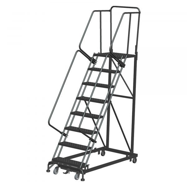 Heavy Duty Stairway Slope Ladder – 600lbs. Capacity. The 50° slope allows easier climbing and descent. The component design allows damaged parts to be replaced which will save money and will extend the life of the ladder. The Base Frame and Rear Vertical are made of rugged 1” x 2” tubing. Weight Actuated Lock Step is easy to use. Steps are 24” wide by 10” deep. This 8 step has a 80” deck height, with Perforated Tread and has a 21” Deep Top Step. Ladder meets OSHA and ANSI standards. Grey Powder Coat finish.