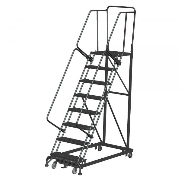 Heavy Duty Stairway Slope Ladder – 600lbs. Capacity. The 50° slope allows easier climbing and descent. The component design allows damaged parts to be replaced which will save money and will extend the life of the ladder. The Base Frame and Rear Vertical are made of rugged 1” x 2” tubing. Weight Actuated Lock Step is easy to use. Steps are 24” wide by 10” deep. This 8 step has a 80” deck height, with Expanded Metal Tread and has a 21” Deep Top Step. Ladder meets OSHA and ANSI standards. Grey Powder Coat finish.