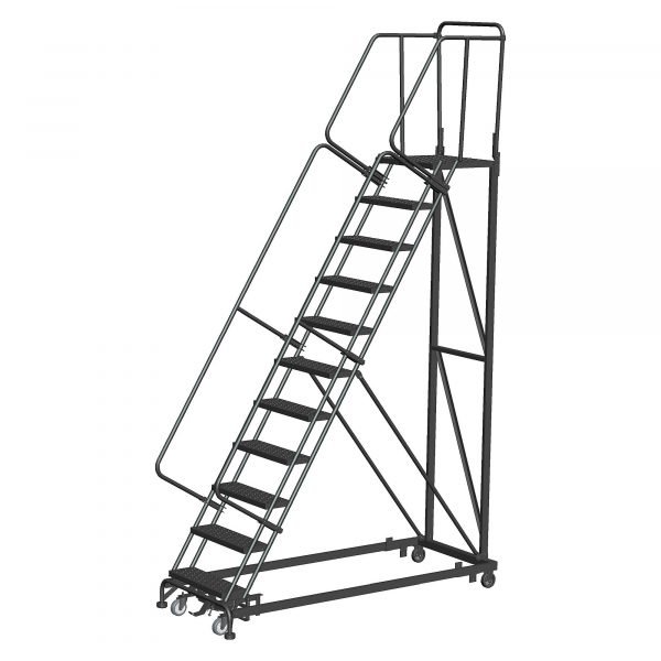 Heavy Duty Stairway Slope Ladder – 600lbs. Capacity. The 50° slope allows easier climbing and descent. The component design allows damaged parts to be replaced which will save money and will extend the life of the ladder. The Base Frame and Rear Vertical are made of rugged 1” x 2” tubing. Weight Actuated Lock Step is easy to use. Steps are 24” wide by 10” deep. This 11 step has a 110” deck height, with Perforated Tread and has a 28” Deep Top Step. Ladder meets OSHA and ANSI standards. Grey Powder Coat finish.