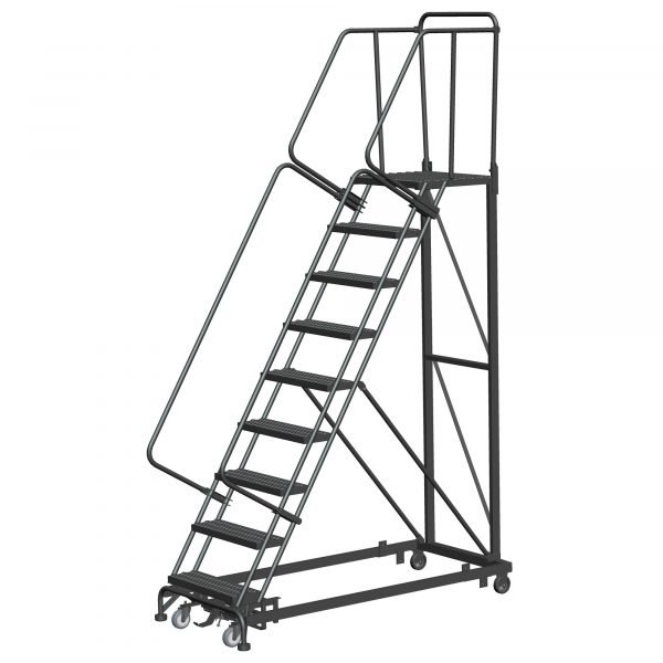 Heavy Duty Stairway Slope Ladder – 600lbs. Capacity. The 50° slope allows easier climbing and descent. The component design allows damaged parts to be replaced which will save money and will extend the life of the ladder. The Base Frame and Rear Vertical are made of rugged 1” x 2” tubing. Weight Actuated Lock Step is easy to use. Steps are 24” wide by 10” deep. This 9 step has a 90” deck height, with Serrated Grip Tread and has a 28” Deep Top Step. Ladder meets OSHA and ANSI standards. Grey Powder Coat finish.