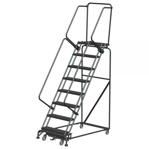 Maximize storage density without sacrificing access using the Ballymore WA082414X Narrow Aisle Rolling Ladder. This 8-step unit, reaching 113 inches, is designed with a streamlined footprint for constricted spaces (24-inch wide base). The heavy-duty steel construction ensures stability, while the Serrated (X) treads provide reliable grip. The Ballymore WA082414X is an essential, safe solution for maneuvering in tight warehouse or shelving aisles requiring high vertical reach.