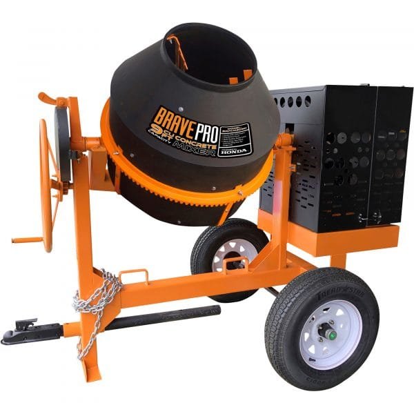 The Brave Pro Gas-Powered 9 Cu. Ft. batch capacity Polyethylene Drum Concrete Mixer with a Honda commercial GX270 gas engine has all the features and benefits that professionals expect. This towable polyethylene drum concrete mixer has a design that ensures durability. Features a durable and easy-to-clean polyethylene drum for extended life and high performance, and a heavy-duty, one-piece, cast iron ring gear for longer life. Reinforced T-frame with 4 gussets for stability and safety (compared to others that only have 2 or no gussets). This Brave Pro unit is loaded with features that make this concrete mixer a great value.