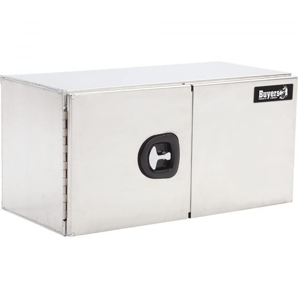 This rugged Buyers Products Underbody Truck Tool Box features .125 mil mill-finish aluminum construction and a continuous, TIG-welded exterior for strength and durability. Barn-style doors recessed with C-section stiffeners swing outward, providing closer access to contents of box.
