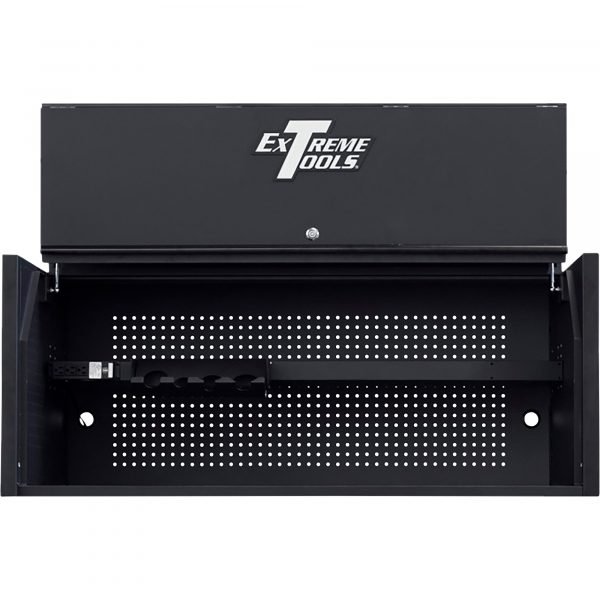 Extreme Tools RX552501HCMBBK is a 55in Power Workstation Hutch in Matte Black. This 25in deep unit provides a stealthy, professional workspace with integrated power for modern automotive and industrial shops.