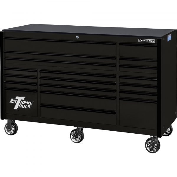 Extreme Tools RX722519RCMBBK-X RX Series 72in 19-Drawer Roller Cabinet is a 25in deep unit in Matte Black. This professional cabinet provides a sleek, non-reflective finish and high-capacity tool storage.