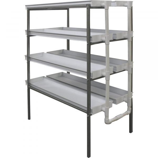 The Fodder King 4–8 Hydroponic System is an economical tray system designed to quickly grow your own pesticide-free feedstock with minimal water. System includes a pump and timer to operate at desired increments. Can be operated as a recirculating system, or drain-to-waste. Complete system includes: 8 PVC channels, 1/8 HP direct drive pump and filter, 5-gal. bucket and strainer, poly punch, plumbing, and PVC primer, cement and cleaner (reservoir not included).