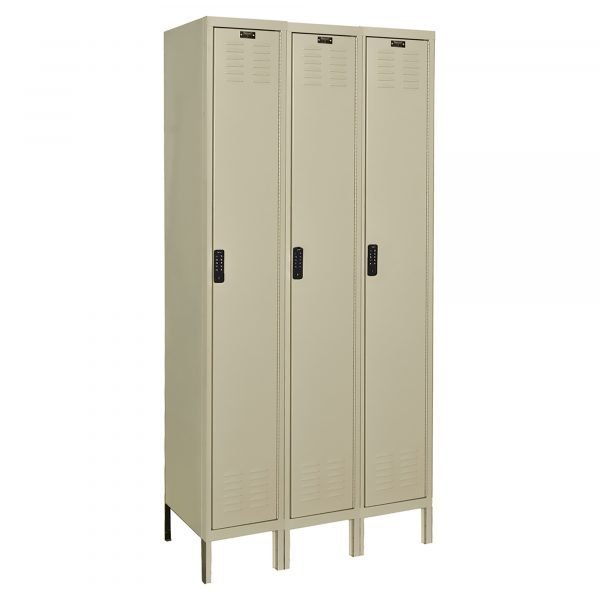 Electronic digital locks allow for shared use by remaining unlocked until a random user locks the door by simply entering a 4-digit user PIN. Upon returning to the locker, the user re-enters their 4-digit user PIN to open the locker—the PIN is then scrambled and the locker is ready for the next user. The lock allows for a Manager’s master PIN as well as a Sub-Manager’s sub-master PIN. Locks can be re-programmed by the Manager for permanent use. User can change their PIN at any time when lock is in Permanent User Mode. Lock doubles as door handle. Doors and frame are constructed of heavy-gauge steel and include a continuous piano hinge to insure a worry-free door operation. Wardrobe lockers allow for larger personal storage while box lockers are perfect for storing of smaller personal items. Electronic digital lock is included. Order 3-wide units for best value and order 1-wide units where needed to complete your layout. Lockers are available to ship fully-assembled or knock-down. Color is Parchment.
