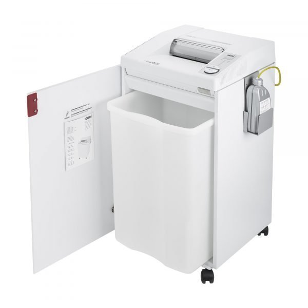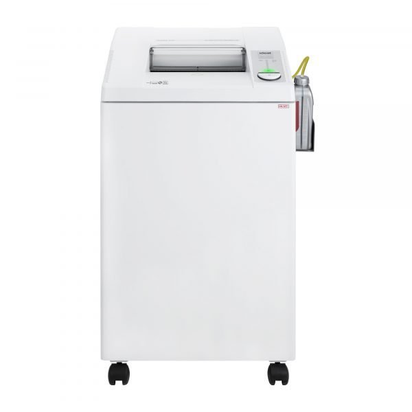 The ideal. 2604 cross-cut P-5 is a powerful, compact, centralized office shredder with automatic oiler, is designed for 6–8 users. Continuous operation and high-quality, solid steel cutting heads minimize downtime while shredding paper, staples, paper clips, and credit cards. The 2604 shredder has a high-quality, easy-to-open, wooden cabinet, mounted on casters for easy mobility. HIPAA and FACTA compliant, and certified to shred Personal Identifiable Information (PII) and Controlled Unclassified Information (CUI), the 2604 is federally accepted to protect information and social security numbers against identity theft. A 10 1/4in. feed opening and lightweight, impact-resistant, easily-removed 26-gallon bin make the 2604 shredder perfect for department or small office needs, and a large but quiet 1 horsepower motor chews through 16 sheets of paper at once and up to 314 sheets per minute. A patented, electronically-controlled, transparent safety shield in the feed opening protects fingers and hands, and the patented Electronic Capacity Control (ECC) monitors and grades document feeding to prevent jams. The automatic oiler lubricates the cutting heads during operation, ensuring optimal performance for the 2604. German engineering and manufacturing ensure superior quality that will provide many years of trouble-free operation. The 2604 is covered by a lifetime warranty on cutting shafts and wheels, 3-year limited warranty on all other parts excluding wearables, and 90-day limited warranty on labor or exchange at ideal’s discretion.