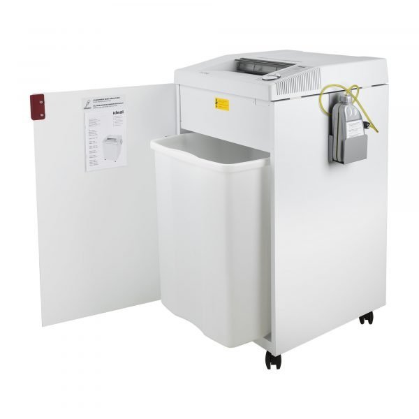Ideal for high-volume shredding, the 3105 cross-cut P-5 shredder with automatic oiler is designed for 10 – 12 users. Continuous operation and high-quality, solid steel cutting heads minimize downtime while shredding paper, staples, paper clips, credit cards, and CD/DVDs. The large, 12” feed opening and hefty, impact-resistant, and easily-removable 37-gallon bin make the 3105 perfect for large department or office needs. A high-quality, wooden, easy-open cabinet is mounted on casters for easy mobility. HIPAA and FACTA compliant, and certified to shred Personal Identifiable Information (PII) and Controlled Unclassified Information (CUI), it’s federally accepted to protect information and social security numbers against identity theft. The large but quiet 2 1/8 horsepower motor chews through 26 sheets of paper at once and up to 661 sheets per minute and requires a dedicated 20 amp line. A patented, electronically-controlled, transparent safety shield in the feed opening protects fingers and hands, and the patented Electronic Capacity Control (ECC) monitors and grades document feeding to prevent jams. German engineering and manufacturing ensure superior quality that will provide many years of trouble-free operation. The 3105 is covered by a lifetime warranty on cutting shafts and wheels, 3-year limited warranty on all other parts excluding wearables, and 90-day limited warranty on labor or exchange at ideal’s discretion. The 3105 is delivered by truck and requires a loading dock for receipt.