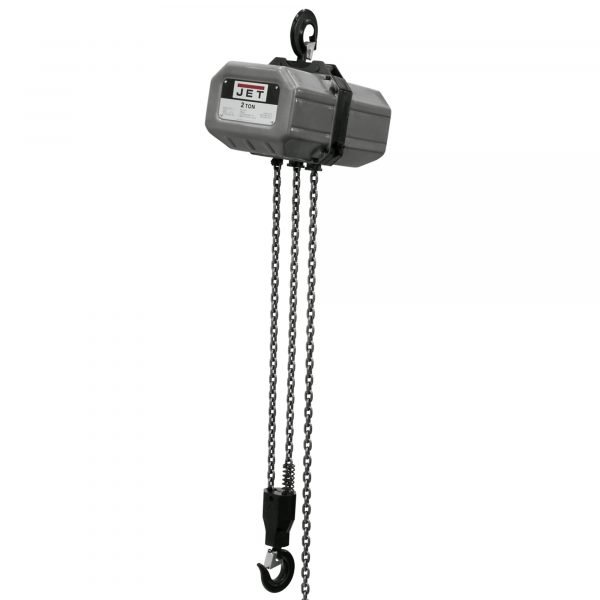 JET SSC Series Electric Hoists combines safety and durability to operate in commercial and industrial applications. All models incorporate a slip clutch overload protection mechanism that prevents the hoist from lifting damaging loads above its rated capacity. They are available in single or three phase configurations to suit your electrical needs. Single phase models have a thermal overload protection design that keeps the hoist from overheating, while the three phase models feature a reverse phase relay that protects the hoist from incorrect wiring. The industry proven DC electro-magnetic brake increases safety by holding the load even when power is interrupted. The maintenance-free gear train incorporates a sealed oil bath, for reliability and durability. The JET SSC Series Electric Hoist is available in 1/2 ton to 5 ton capacities with standard lifts of 10, 15, and 20ft. (custom lifts available).