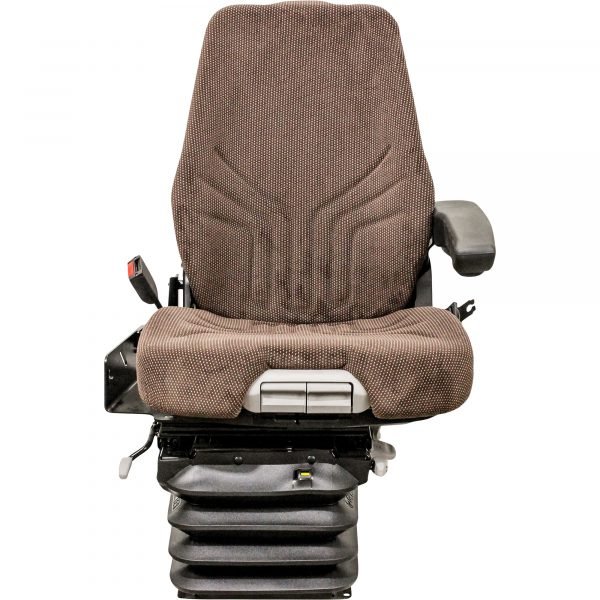 This K&M Grammer Combine Seat and Air Suspension is a unique drop in replacement seat from Grammer Seating that is a duplicate of the OEM seat for John Deere combines, self- propelled forage harvesters and self-propelled and draper windrowers. It provides a smoother, more comfortable ride that will keep you working in maximum comfort while enduring every type of rough terrain. The air suspension has a self-contained 12V compressor which wires directly to the tractor’s electrical system. The seat has all the same functionality and features of the original OEM seat, like control arm console brackets. The only differences include variations in cushion color and any special knob colors. Includes a durable suspension cover to keep components free of dirt and dust. Brown.