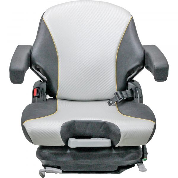 This low-profile K&M Big Dog/Hustler Grammer Construction Mechanical Suspension drop in replacement seat assembly with durable cut and sew vinyl cover significantly lowers vibrations to add more comfort while driving your ride-in lawn mower. Mechanical lumbar support helps prevent lower back pain. Adjustable fold-up armrests add comfort and a retractable seat belt with switch provides added safety. 24in.W x 22in.D x 22in.H. Black and Silver with Yellow piping.