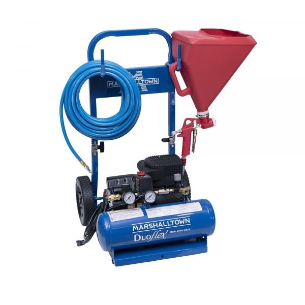 With a 1 year warranty for all the parts, MARSHALLTOWN’s DuoFlex provides two outlets that compress air for air tools and hopper guns. This product comes with the choice of just the compressor, the compressor with the choice of a gun, or just the compressor hose and couplings. The choices of guns available are the SharpShooter I, Sharpshooter 2.1, SprayMate, or the QuickShooter that all have their own benefits and produce quality work. This compressor has a 1000-hour pump life and will give you more than enough PSI in air delivery. The DuoFlex will deliver the compression you need for professional results. Made in the USA with Global Materials