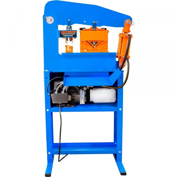 This METALpro Ironworker is practically an entire fabrication shop in one machine! Electric/hydraulic power offers a wide variety of metal production projects: punching, shearing, notching, bending, pressing and forming. Punches 1in. dia. in 3/8in. steel.