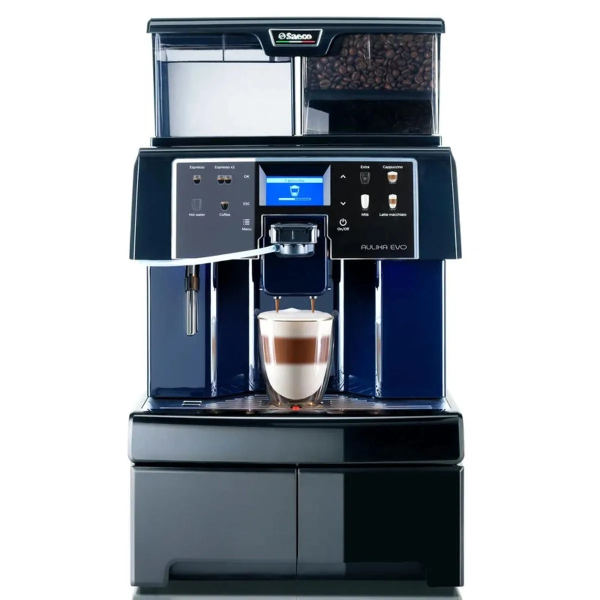 The Saeco Aulika TOP HSC EVO is a heavy-duty, commercial-grade super-automatic espresso machine designed for high-volume environments like offices, small businesses, or catering services. The "HSC" (High-Speed Cappuccino) designation highlights its ability to dispense milk-based drinks very quickly. It features dedicated double circuits (two pumps and two thermoblocks) for zero waiting time and superior thermal stability. A key feature is its large capacities, including a 4L water tank and 1kg bean hopper, ensuring sustained operation. The machine offers One-Touch Cappuccino functionality via an integrated milk frother and can be easily switched to operate from its internal tank or be plumbed directly into a water line (on specific variants, check model). The Aulika EVO includes a new design, backlit icons, and a durable conical grinder for consistent results.Saeco Aulika Specifications