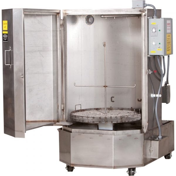 The SprayMaster 85-Gallon Aqueous Spray Parts Washer features large 30in. turntable with 40in. working height. Includes high-volume 3 HP pump with stainless steel impeller. 9.0 KW heater with 0-60 minute cycle timer and stainless steel gasket-free front door. 85-gallon capacity. 11 1/2in. stainless steel disk skimmer with 500-lb. capacity. Low liquid sensor deactivates heaters to avoid damage. Durable friction turntable won’t break if a small part gets lodged. Please allow 4 – 6 weeks for delivery.