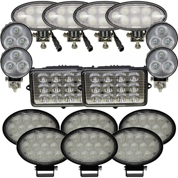 This Tiger LED 16-Light Flood/Spot and Flood Combine Light Kit offers quick and easy light replacement or enhancement for your John Deere Series S, T, and W combines. The plug and play 12V to 24V LED lights have die-cast aluminum housing that dissipates heat to increase light output and improve performance. Has a durable polycarbonate lens and stainless steel hardware. IP68 rated to prevent dust and water penetration. RoHS compliant. 16-light kit includes replacement lights for all upper cab, side row finder, stubble, field and auger lights. 46,000 combined effective Lumens. Designed to fit compatible models listed on this page. Please verify compatibility with your combine make and model before ordering.