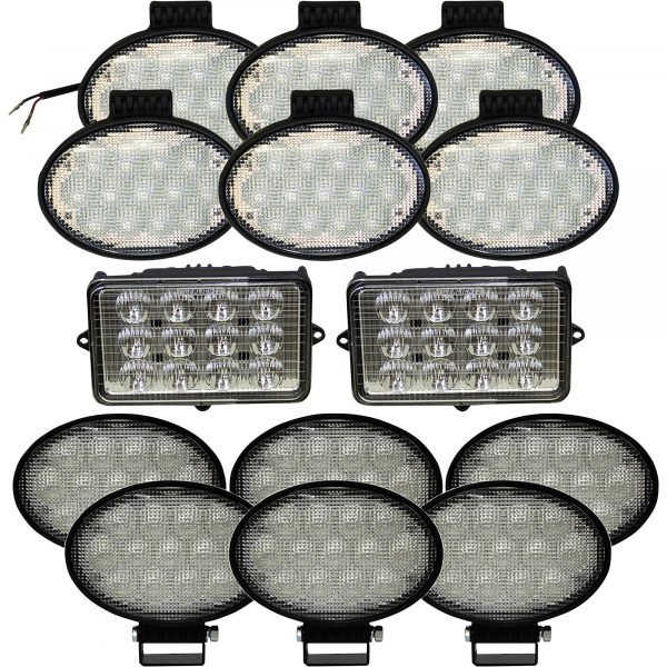 This Combine LED Light Kit from Tiger Lights is a complete plug and play replacement LED light kit for all upper cab, side row finder, stubble, grain tank, auger and field lights on John Deere Sidehill, 9060, 9070 and STS Series combines with large oval cab lights. The kit includes: 14 lights (6 upper cab, 2 side row finder, and 6 stubble, grain tank, auger and field lights), connectors, adapters and hardware.