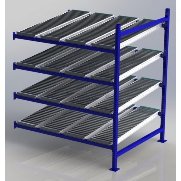 - 60×48″ roller rack adder unit with 4 gravity flow tiers.