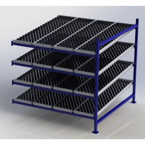 - 72×72″ skatewheel rack adder unit with 4 flow tiers.