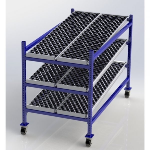 - 36″ wide mobile skatewheel rack with 72″ deep flow tiers.