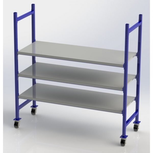 - 76″ wide mobile steel shelf; 28″ deep with 3-tier storage.