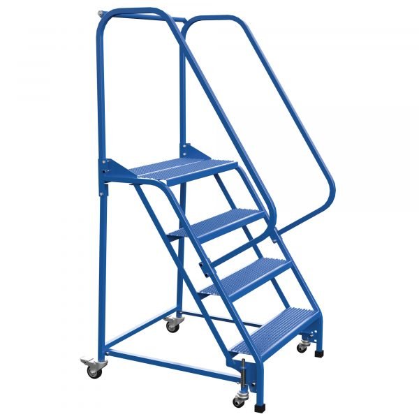 The Standard Slope Ladder is a portable warehouse ladder for every-day use applications. Perforated steps, handrail included and welded square tubular steel construction with powder-coat blue finish. Rubber feet provided for floor protection. Unit has (2) Two all directional spring-loaded swivel casters and (2) Swivel casters with total locks. Ships fully assembled and ready to use.