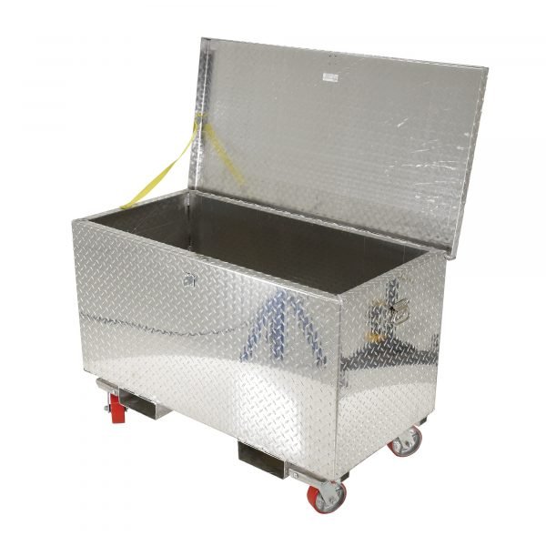The Aluminum Portable Toolbox is excellent for storing and transporting equipment. The heavy duty welded aluminum tread plate construction is designed to tolerate the toughest of environments. Additional features also include ergonomically friendly carrying handles on each end for smooth manual transporting and a hinged lid which includes a lockable double hinged hasp for added security. Casters are included for simple portability between work areas. Fork pockets are attached to the units underbelly for lifting and maneuvering between areas.