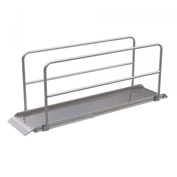 The Aluminum Walk Ramp with handrails enables delivery men/women, shippers, and receivers to load and unload trucks when docks are unavailable. Heavy-duty steel chains with steel grab hooks are attached to each side of ramp for safely securing ramp to truck. Constructed of strong aluminum alloy with non-skid tread surface. The ramp is lightweight and easy to handle. This overlapping style rests on the truck bed.
