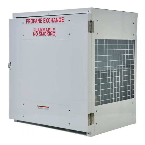 Durable steel propane exchange Cylinder storage cabinet for storage of standard propane gas cylinders. The sides are made of expanded steel mesh, the bottom, back and top are made of solid sheet steel. The front door is an expanded steel mesh panel. The door features stainless-steel spring-loaded hinges.