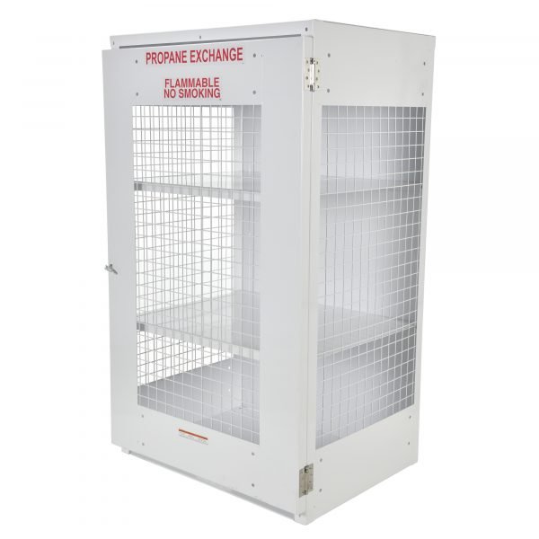 Durable steel propane exchange Cylinder storage cabinet for storage of standard propane gas cylinders. The sides are made of expanded steel mesh, the bottom, back and top are made of solid sheet steel. The front door is an expanded steel mesh panel. The door features stainless-steel spring-loaded hinges.