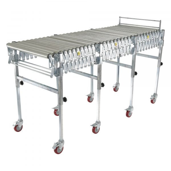 Expandable roller conveyor is the perfect asset for packaging and distributing facilities. The conveyor provides the user an ergonomically friendly way to transfer goods while minimizing the bending and twisting during shipping and handling. A strong construction provides strength for transferring large awkward products. The conveyor can be expanded to reach greater distances between packaging points. Once finished it can be retracted to fit in a condensed area.