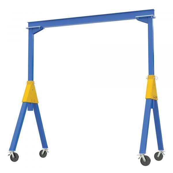 The Fixed Height Knockdown Industrial Steel Gantry Cranes are uniquely designed to be disassembled when not in use for compact storage and easier transportation / shipping from one job site to another. Facilitate easy mobility from one area to another with total locking casters. The Total Locking Casters lock the rigging in any position and locks the wheel from rotating. Features quick setup design. Do not move units while loaded. Painted blue finish. Designed for semi-permanent or permanent applications. Requires assistance from fork truck to set-up.