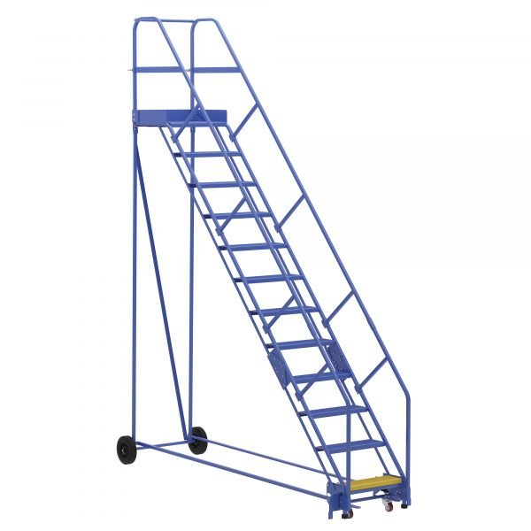 The Rolling Warehouse Ladder is a great addition to material handling and shipping facilities. The powder coated steel construction maintains a strong, durable design throughout a lifetime of use. The steps include a perforated design and a 50° climb angle that promotes stability while climbing and/or descending the ladder. The bottom step is colored yellow for additional safety and minimization of injuries when traversing the ladder with heavy loads.