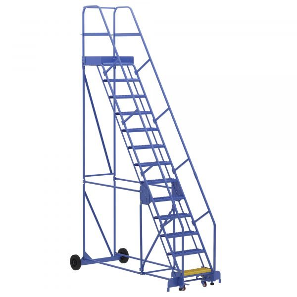 The Rolling Warehouse Ladder is a great addition to material handling and shipping facilities. The powder coated steel construction maintains a strong, durable design throughout a lifetime of use. The steps include a grip strut design that promotes stability while climbing and/or descending the ladder. The bottom step is colored yellow for additional safety and minimization of injuries when traversing the ladder with heavy loads.