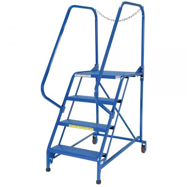Portable Maintenance Ladder for use around warehouses, hardware stores or inventory rooms. Tilt the unit to allow for portability. Constructed of square tubing framework. Features removable hand railing, access chain, perforated steps and an industrial blue powder coat finish.