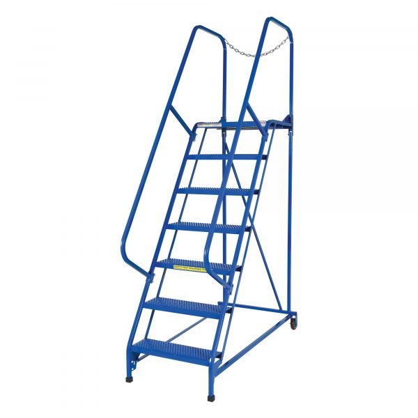 Portable Maintenance Ladder for use around warehouses, hardware stores or inventory rooms. Tilt the unit to allow for portability. Constructed of square tubing framework. Features removable hand railing, access chain, perforated steps and an industrial blue powder coat finish.