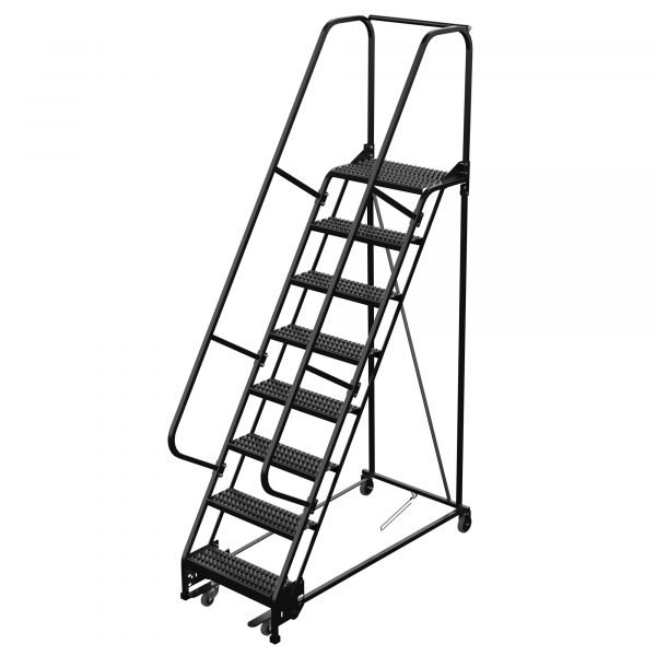The Standard Slope Ladder is a portable warehouse ladder for every-day use applications. Grip strut steps and handrail included. Rubber feet provided for floor protection. Unit has bottom step lock casters for safe use when climbing. This ladder features anti-static properties: conductive semi-gloss black powder coat finish, conductive wheels which features gray rubber tread on polyolefin core and grounding drag chain with resistor, nickel-plated brass construction. Ladder must be used on conductive floors to comply with ESD properties. Ships knockdown.