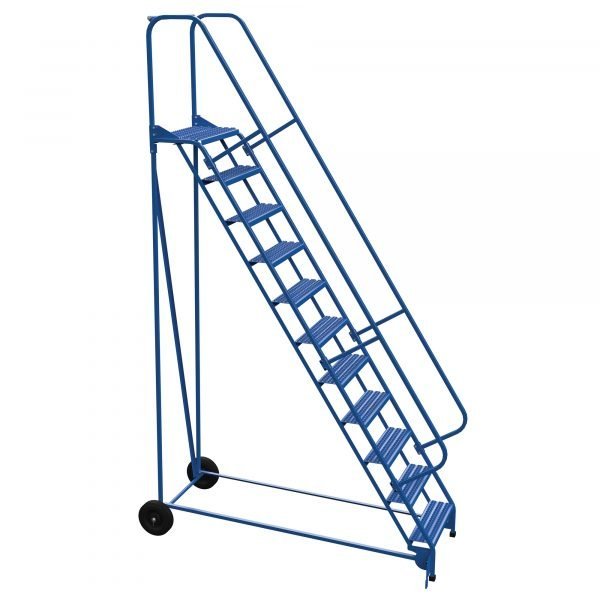 Roll-A-Fold Ladder, the portable ladder that conveniently folds for storage. Constructed of square tubing framework. Features removable hand railing, deep top platform, grip strut steps, and an industrial blue powder coat finish. Unit rolls around on large wheels.