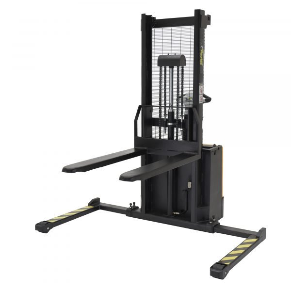 The Stacker with Powered Drive and Powered Lift is a fully powered electric stacker that transports loads throughout warehouse facilities quickly and with less effort. The high torque drive and lift motor handles heavy-duty jobs. The ergonomic handle features easy-to-operate throttle with infinite adjustment of forward and reverse speeds, lift/lower controls, proprietary safety-enhancing emergency reverse function, and horn. When the Proprietary Safety-enhancing Emergency Reverse function is actuated, the emergency reverse belly switch instantly reverses direction and moves the unit forward (away from the operator) until the switch is released or after five seconds have elapsed. The built-in safety circuit will automatically disable the entire unit if the emergency reverse belly switch is activated for more than five (5) Seconds after which the unit must be re-set to return to normal operating conditions. This state-of-the-art safety device provides a high degree of operator protection. It includes an electromagnetic disc brake with automatic dead-man feature that activates when user releases the handle. The power lifter features a lead acid deep cycle battery, integral battery charger, and a battery level gauge. The stacker rolls smoothly on poly-on-steel steer and load wheels.