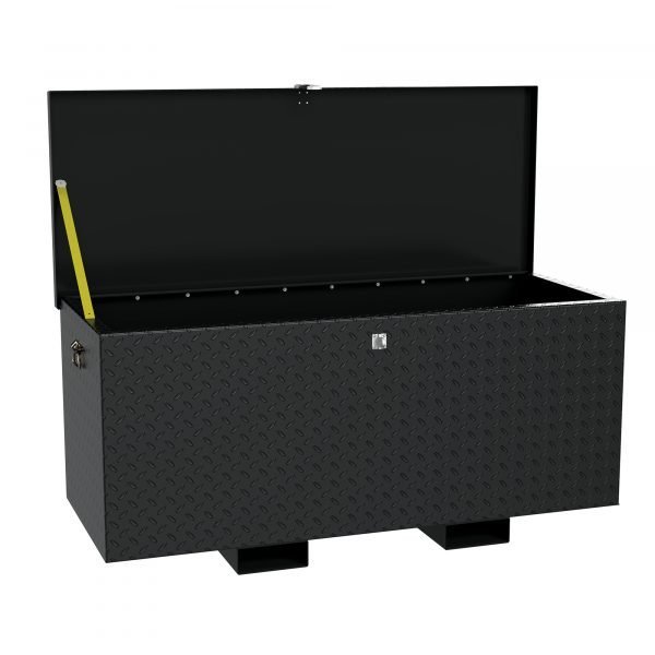 Secure your tools and belongings with a steel treadplate storage Box. With a steel construction, outside damage to stored objects is minimized. A centrally located hinged safety hasp makes it simple to secure the box with a padlock (padlock is not included). A handle is attached to each end of the box for easier lifting and maneuvering. Powdercoat finish for baked in added toughness. Fork pockets are attached to the base of the unit for portability between areas.