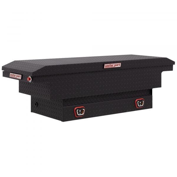 The Weather Guard 131-52-03 66in Standard Saddle Box (Aluminum Matte Black) is a mid-size, lightweight crossover tool box designed to sit across the truck bed rails, perfectly fitting most standard short-bed trucks, and constructed from corrosion-resistant aluminum with a sleek matte black finish for a modern, professional look. This 66-inch box offers superior durability and weather resistance while minimizing vehicle weight, making it ideal for professionals who require generous storage capacity with reduced fuel impact in their standard work vehicle. Contractors rely on the lightweight strength, ample capacity, and superior security of the Weather Guard 131-52-03 66in Standard Saddle Box for efficient, reliable tool protection and retrieval.