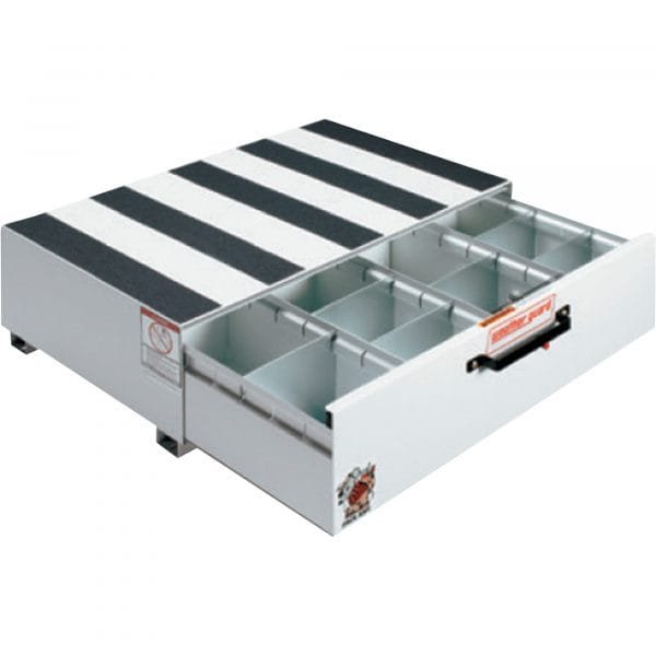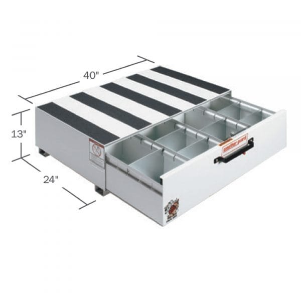 This Weather Guard Pack Rat Short Truck Box Storage Drawer provides handy, heavy-duty storage that keeps your truck bed or cargo van storage space open and your supplies organized. The short drawer unit has 4 compartments with 12 dividers and features a roll-out drawer load rating of 425 lbs. evenly distributed. The 14-ga. steel top and sides have their own load rating of 750 lbs. when weight is evenly distributed. This unit can be mounted inside the rear of the vehicle to provide easy access to large tools and supplies while leaving floor space open. 24in.L x 40in.W x 13in.H overall size. ARMOR TUF Brite White powder-coat finish. Limited lifetime warranty ensures unparalleled quality.