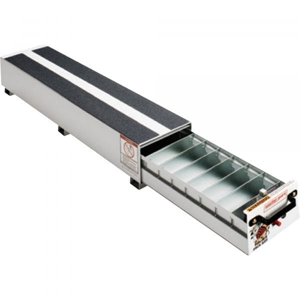 This Weather Guard Pack Rat Slim Truck Box Storage Drawer provides handy, heavy-duty storage that keeps your truck bed or cargo van storage space open and your supplies organized. The slim drawer unit has 1 compartment with 6 dividers and features a roll-out drawer load rating of 425 lbs. evenly distributed. The 14-ga. steel top and sides have their own load rating of 750 lbs. when weight is evenly distributed. This unit can be mounted inside the rear of the vehicle to provide easy access to tools and supplies while leaving floor space open. 48in.L x 10.25in.W x 9.5in.H overall size. ARMOR TUF Brite White powder-coat finish. Limited lifetime warranty ensures unparalleled quality.