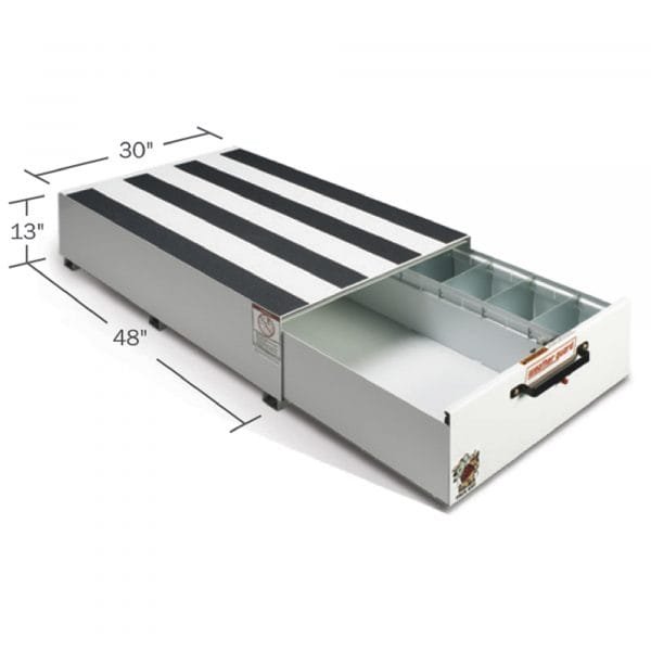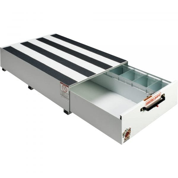 This Weather Guard Pack Rat Truck Box Storage Drawer provides handy, heavy-duty storage that keeps your truck bed or cargo van storage space open and your supplies organized. The drawer unit has 2 compartments with 6 dividers and features a roll-out drawer load rating of 425 lbs. evenly distributed. The 14-ga. steel top and sides have their own load rating of 750 lbs. when weight is evenly distributed. This unit can be mounted inside the rear of the vehicle to provide easy access to large tools and supplies while leaving floor space open. 48in.L x 30in.W x 13in.H overall size. ARMOR TUF Brite White powder-coat finish. Limited lifetime warranty ensures unparalleled quality.